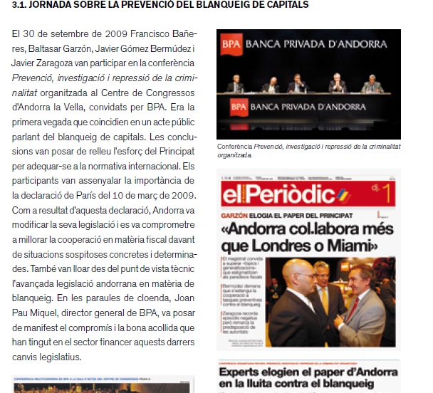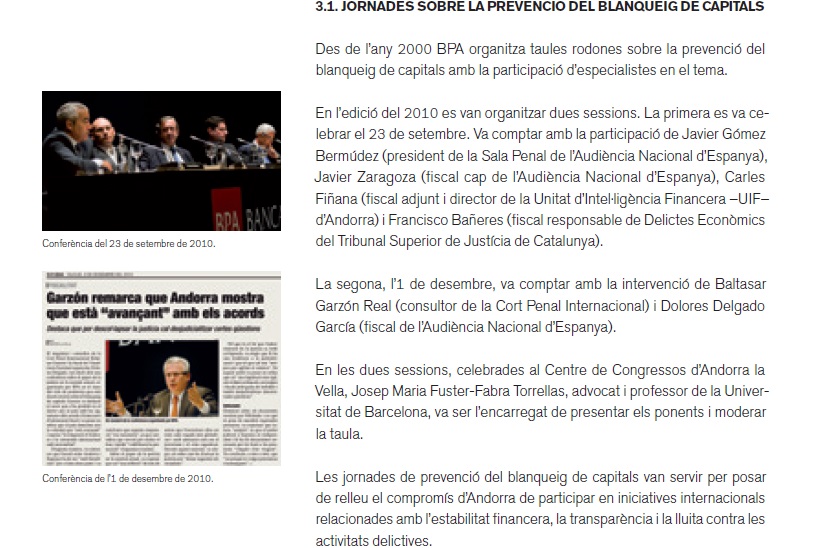 Ara, amb la perspectiva del temps, resulta gairebé grotesc descobrir que un banc que ha signat la seva sentència de mort per culpa de blanqueig de diner d’origen criminal, esmercés un volum considerable de recursos en organitzar unes jornades anuals titulades “Prevenció, investigació i repressió de la criminalitat” que comptaven amb convidats estel·lars com l’ex-jutge Baltasar Garzón, el jutge en exercici Javier Gómez Bermúdez o el fiscal de delictes econòmics del TSJC Francisco Bañeres. Les conclusions d’aquests congressos sempre venien a dir que les coses s’estaven fent molt bé a Andorra en matèria de blanqueig, afirmació que vist tot el que ha passat podem interpretar de forma molt diferent a com ho haguéssim fet en aquell moment.